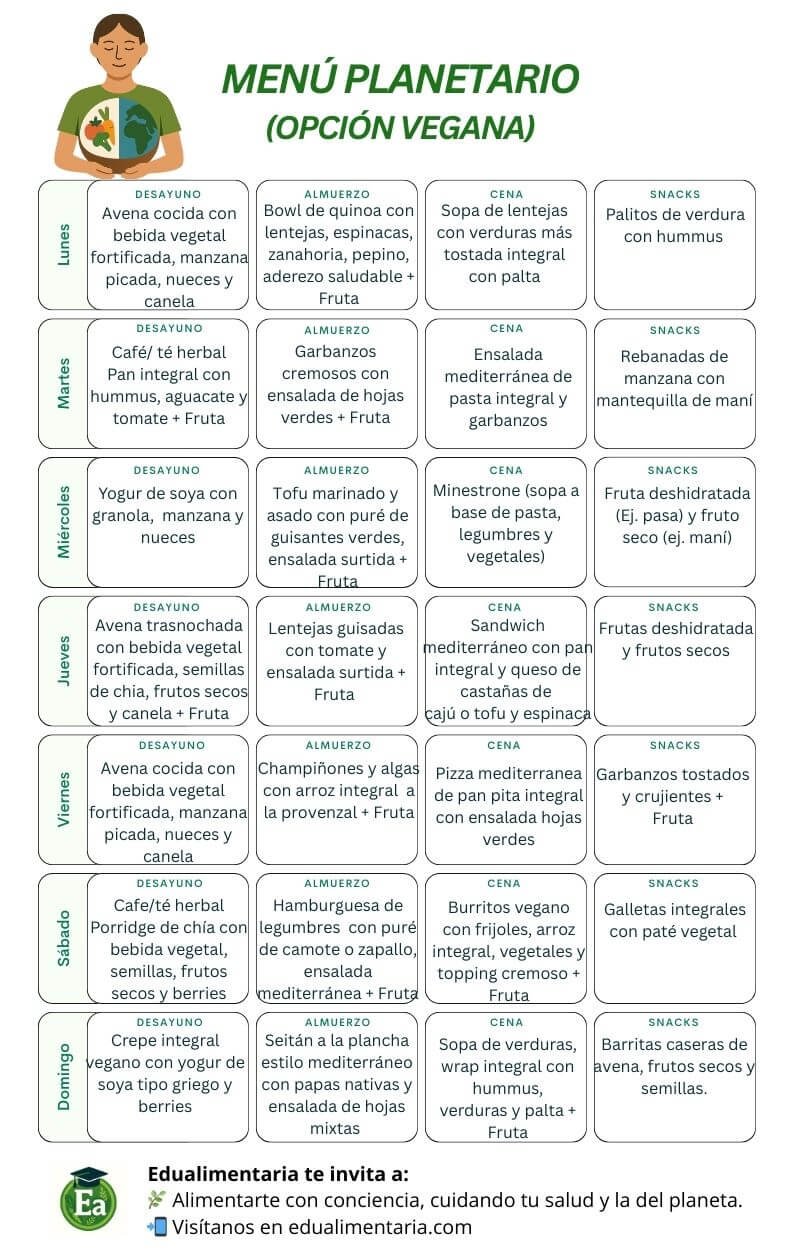 🌱Opción vegana: 100% basada en plantas, equilibrada y completa, ideal para quienes prefieren evitar los alimentos de origen animal y desean seguir el patrón planetario priorizando legumbres, semillas, cereales integrales, frutos secos, verduras y frutas.