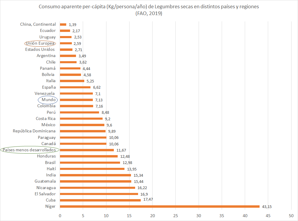 En el 2019 el consumo aparente per cápita mundial de legumbres secas fue igual a 7,13 Kg/año/persona (equivalente a 19,53 g/persona/día). Para los países menos desarrollados este consumo fue igual a 11,67 Kg/persona/año; mientras que el consumo per-cápita de la Unión Europea fue igual a 2,59 Kg/persona/año. Los principales países consumidores de legumbres son Níger, Rwanda y Emiratos Arabes Unidos (Figura 2).